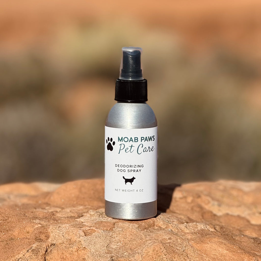 • Help protect your pet from fleas, ticks, and biting insects and get rid of that stinky dog smell with our dog spray. Formulated with witch hazel, organic vegetable glycerin, and dog safe essential oils, this all natural spray is great to use before or after they spend time outdoors, or when you don't have time for a full bath. It will help ward off insects, lightly cleanse their skin and fur, and neutralize bad odors to keep your pet, vehicle, and home smelling fresh. Comes in a 4 oz spray bottle for easy application.