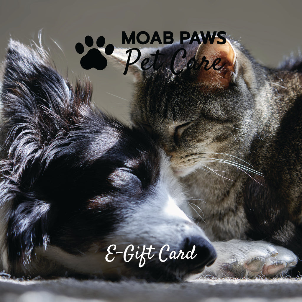 Shopping for an animal lover who lives in Moab or visits often, but not sure what to give them? How about a Moab Paws Pet Care gift card?! These gift cards are redeemable for all of our pet care services and products.